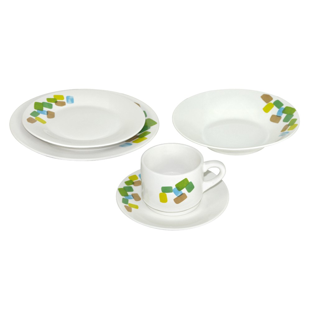 The plate set consisting of 20 pieces. The dinner plate of 23 cm (4 pcs), the soup plate 20 cm (4 pieces), fruit plate 19 cm (4 pieces). It has a design very beautiful and combined with any environment that can have your kitchen. It consists of porcelain material which makes you be very hygienic. Serve adequately and enjoy a nice meal by giving proper atmosphere, the importance of the festive nice detail your everyday life and your days marked. Set consisting of four dinner plates, four soup plates, four dessert plates, four cups of tea are the ideal solution, functional and aesthetic enough for your table. Easily cleanable even in the dishwasher.