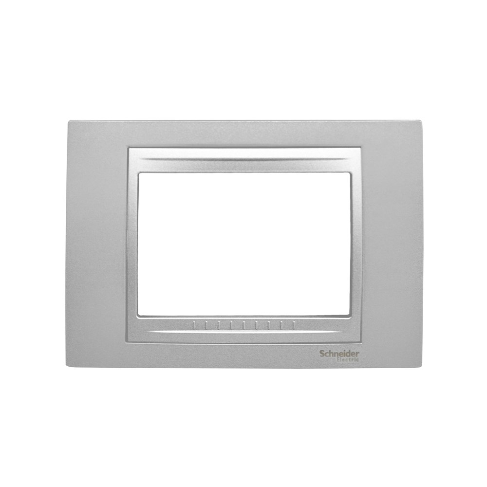 Unica Top cover frame from Schneider is a metallic top quality product with aesthetical features. The aluminium color of the frame can be easily combined with every wall color. This cover frame is suitable for only three modules (1 Shuko socket or 1 switches plus 2 bivalent socket).