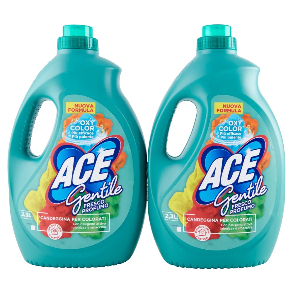 Clean your colored clothes from any stains thanks to ACE Gentile parfumo fresco bleach. Thanks to the new Oxy Color formula, ACE Gentile bleach also removes grease stains and oxidizable stains, remaining safe for colors and fabrics and also removing germs and bacteria. The addition of active oxygen also eliminates bad odors, replaced by fresh scent.