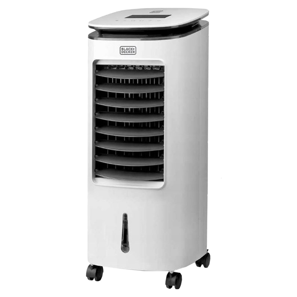 A lovely breeze that feels cooler than a fan. This air cooler or air cooler from BLACK+DECKER takes care of that. An air cooler is a kind of fan that cools by means of water evaporation. The air sweeps past a cooling element, in this case a container with ice cubes that is placed in the water reservoir, and then gives the effect of a fresh mist. As if you are standing near a waterfall or fountain.An air cooler is not air conditioning, but it is much more economical than an air conditioner. The cooling elements absorb the heat, after which the air becomes cool and moist in a natural way. The powerful fan then pushes this air into the room through the oscillating grilles. In addition to cooling, this BXAC5E also humidifies the air in dry rooms. You can set this air cooler at 3 air speeds. It is compact and easy to move thanks to the wheels and the large handle. It has a capacity of 5 liters and because the removable water tanks are transparent, you can see exactly when you need to refill them. The colder the water, the cooler the air. That is why you can also put the supplied ice packs in the tanks. A handle on the top and the 4 wheels on the bottom make it easy to move the cooling device.