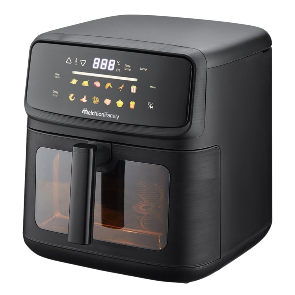 The MARTINA 10L air fryer with dual black heating elements is a compact and elegantly designed appliance, ideal for those seeking healthy and quick cooking. Its 10-litre capacity allows for generous portions, while the plastic coating ensures lightness and ease of cleaning. The device features a colour display and a switch for simple and intuitive control of the functions. Thanks to the dual heating elements, the fryer ensures even heat distribution, with adjustable temperatures ranging from 80 to 200 degrees Celsius to suit various recipes and types of food. The power consumption is 2100 watts, while the noise level is 51.90 decibels, ensuring discreet use in the kitchen. The built-in timer allows precise cooking time settings, optimising results. This model operates on 220-240V power supply at 50/60Hz, maintaining simple and reliable operation. The MARTINA air fryer represents a versatile and technologically advanced solution for those looking for an efficient and high-performing appliance, capable of delivering crispy and tasty cooking without excessive use of oil.