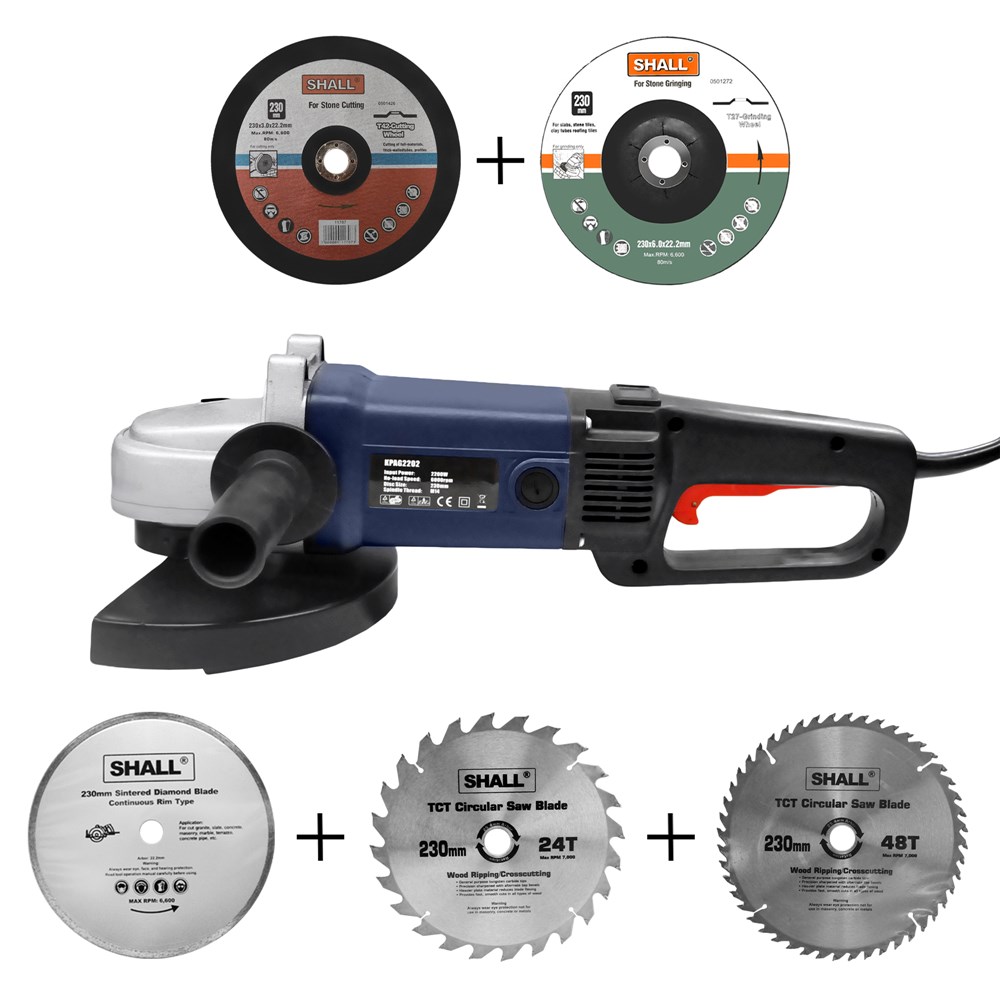 KIT Angle grinder 2200W + 2 piece diamond disc/continous type 230x5x22.2 for cutting stone, 2 piece saw blade for wood 230x24tx22.2mm, 2 piece Saw blade for wood 230x48tx22.2m, 2 piece Cutting disc for stone 230x3x22.2mm, 2 piece Grinding disc for stone 230x6x22.2.