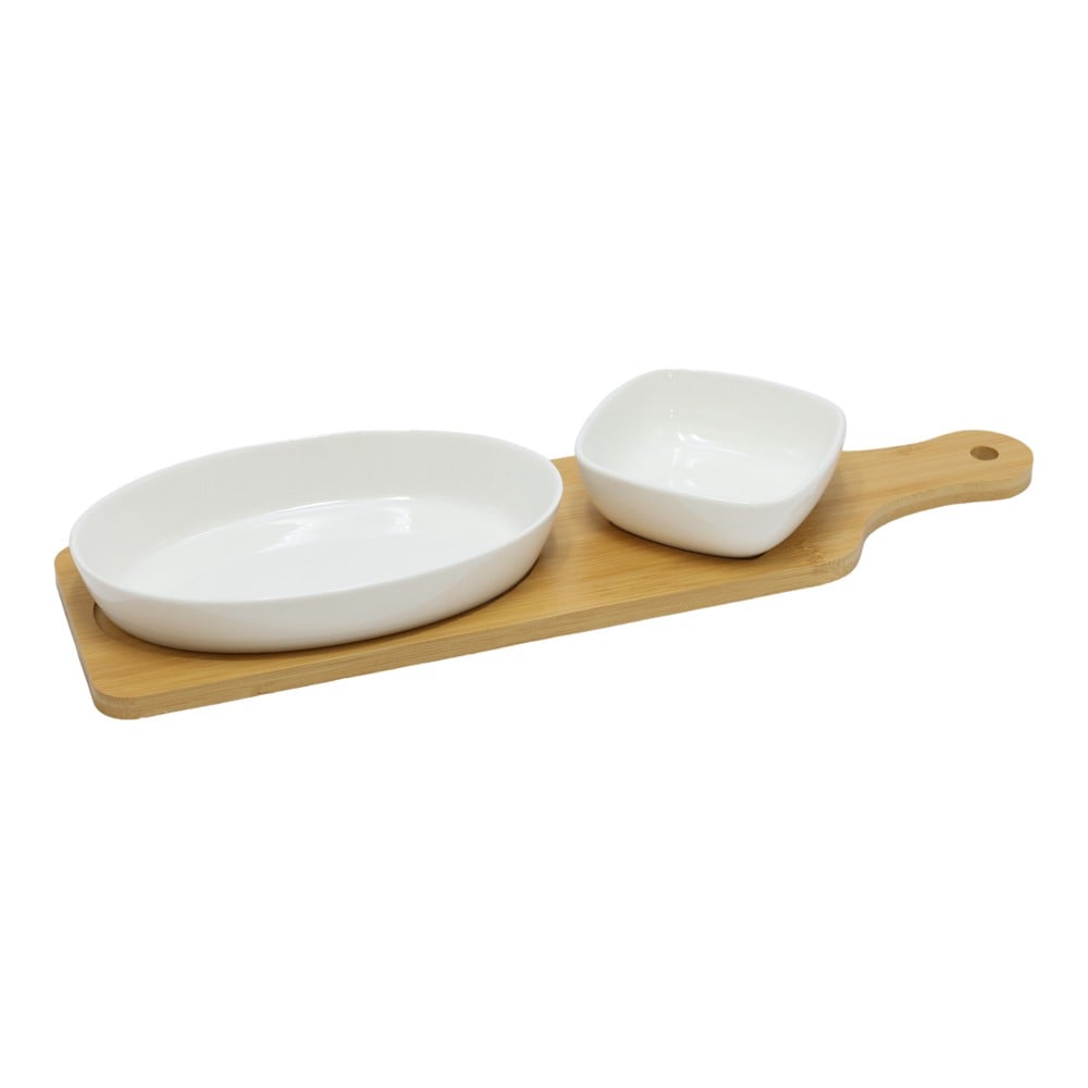 The Tasa Antipasta set with holder uses a beautiful combination of pottery and bamboo for a modern and eco-friendly design. With 12x38x4 cm dimensions, this set offers an elegant and practical representation for the service of antipasti or other food cocktails.
