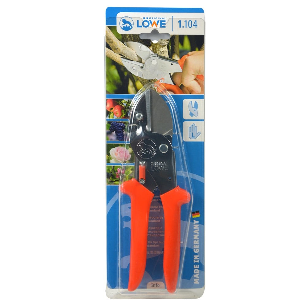The LÖWE No. 1 has made the brand Original LÖWE known and the anvil principle - a pulling cut against a fixed support - world-famous. LÖWE No. 1 is one of the most widely used and highly robust products in the world of professional wine, fruit and horticulture. In contrast to the bypass shears, where the blade and the counter blade pass each other, the anvil shears the blade on a solid support, the anvil. This principle has, inter alia, The following advantages: • Perfect power transmission • Also suitable for use in hard wooded plants • No cutting • Less force required for cutting • Protection of hand and wrist • Low maintenance costs • Suitable for right- and left-handers • Blade with non-stick coating • Made in Germany