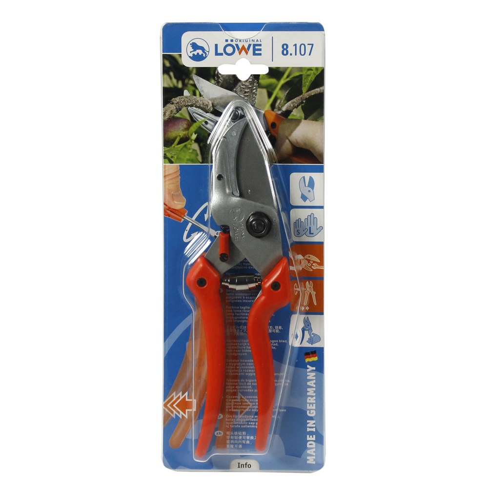 The LÖWE 8 anvil technology with bypass geometry - the best of two worlds. A combination of the advantages of anvil and bypass shears. In addition to the above, The advantages of an anvil shears are the shears with the curved blade and slim design: • Ideally suited for cutting in difficult-to-access areas • Prevents the cut material from slipping out • Enables cutting close to the trunk Other original LÖWE features of these scissors: • Infinitely variable handle width adjustment • Easily replaceable blade with non-stick coating • Scissor body and blade corrosion protected • Suitable for right- and left-handers • Made in Germany