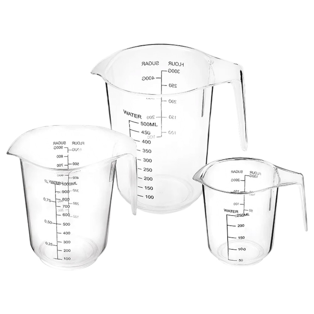 The Aqua 3-piece measuring cup set is an essential accessory for any kitchen, making the cooking and baking process more precise and easier. The set includes three cups with different capacities: 250 ml, 500 ml, and 1000 ml. Each cup has a clear and legible scale, allowing you to accurately measure liquids and dry ingredients. This ensures that your recipes are always a success. Made from durable plastic, the cups are lightweight, resistant, and not easily broken. The transparent color allows you to clearly see the level of the ingredients inside. The ergonomic design and comfortable handle make these cups easy to use. They are suitable for measuring water, oil, milk, sugar, flour, and many other ingredients, making them an excellent choice for any home cook or professional chef.
