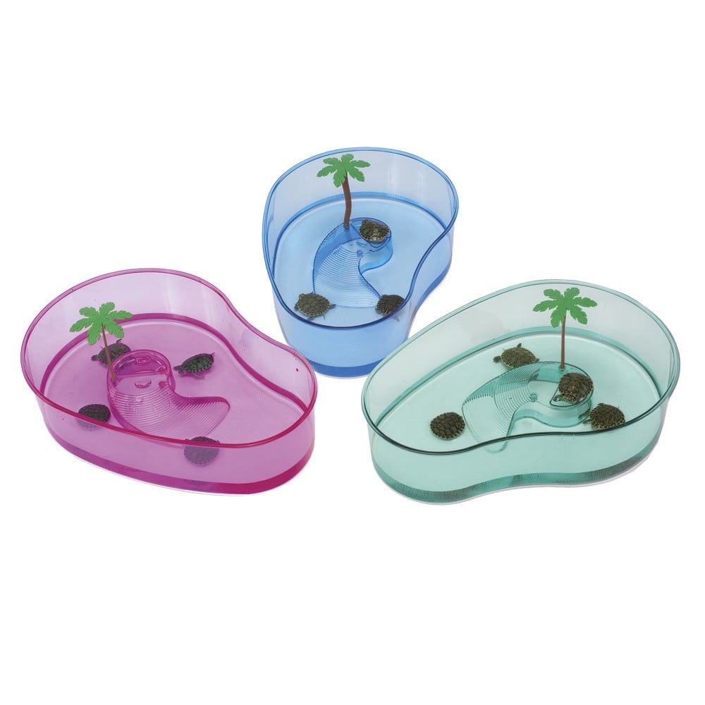 This small round shaped turtle bowl is a nice and colorful bowl to welcome your little animals. Sammy is a transparent plastic tray available in three colors: fuchsia, blue and green. Easy to clean due to its small size, it comes complete with an islet with palm trees, easily reachable by the turtles thanks to small steps.