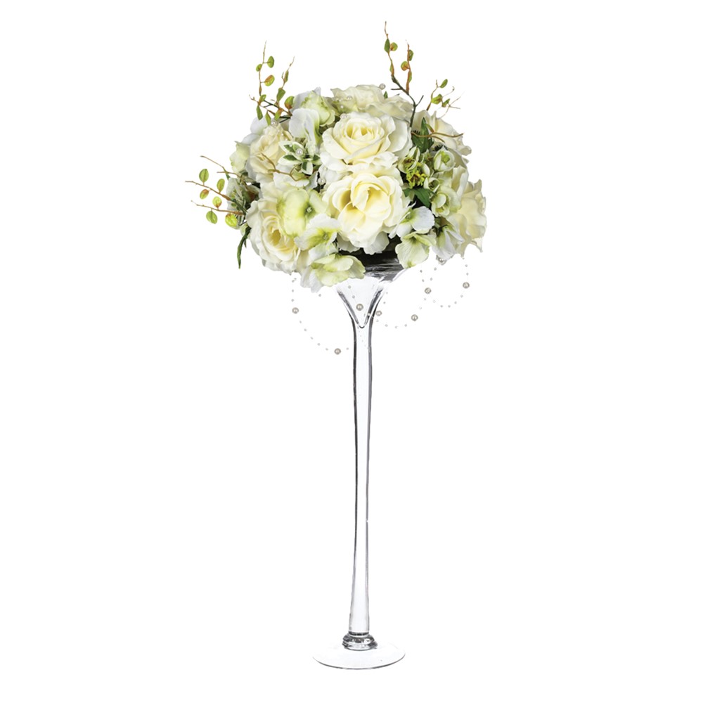 A rose arrangement with an elegant glass vase, is perfect for a home table or even a party. The white color gives warmth and elegance to the table.