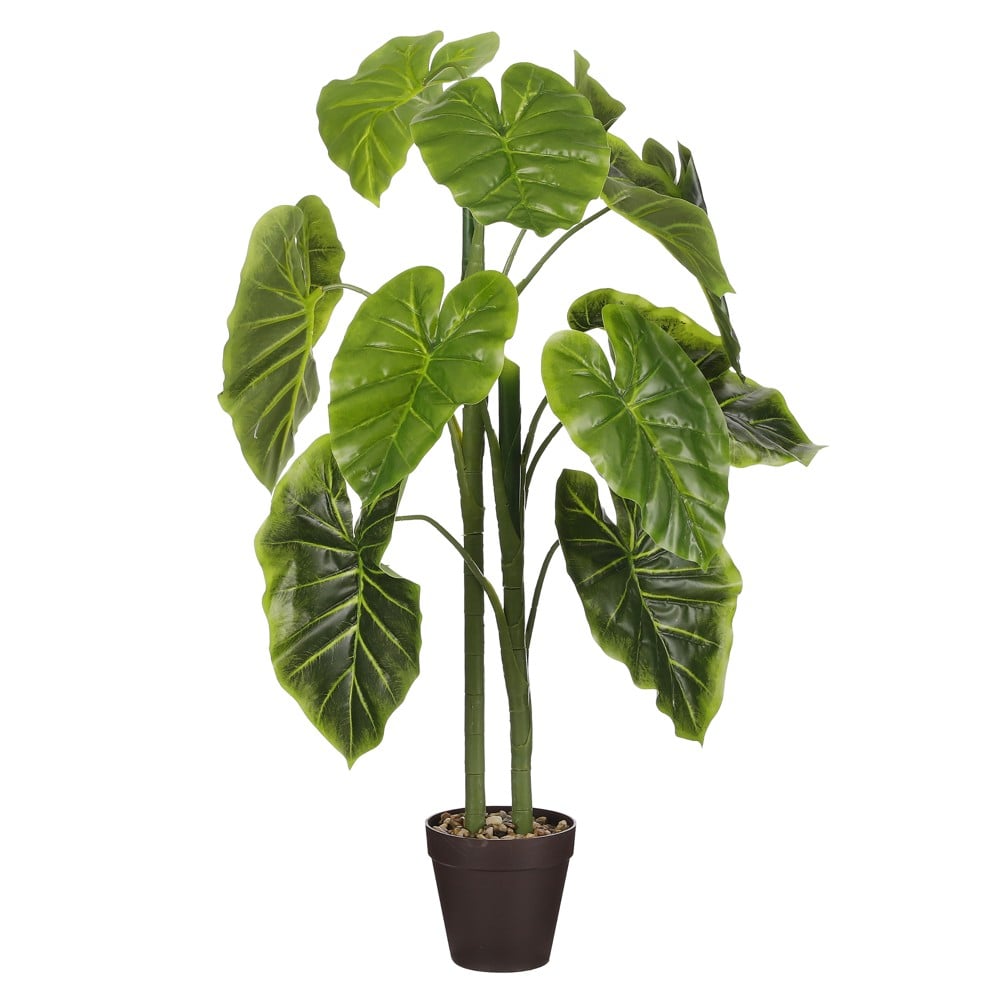 With this artificial Alocasia plant you get a piece of the Asian rainforest in your home. This plant is characterized by its beautiful, wide and long leaves. These dark green leaves have bright light green veins that give them a striking appearance. The plant comes with a black, sturdy pot that you can place in a beautiful vase to match your interior. This vase has a diameter of 13 cm and a height of 12 cm. The plant itself has a height of 100 cm and a diameter of about 50 cm.