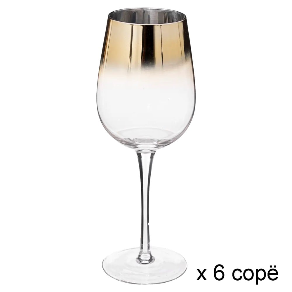 Wine glasses with throne with packaging of 6 pieces and volume of 380 ml. The glasses are very fine, with a gold colored top. Good glass material, the glasses are easy to clean and in the dishwasher.