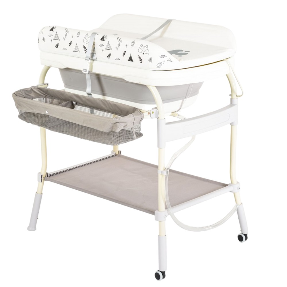 Baby bathtub with holder and changer, suitable for children from 0 m+ to 11 kg. It has a digital color thermometer. The thermometer indicator is colored according to the heat of the water. Blue - the water temperature is too cold, green - the water temperature is suitable for bathing the baby, red - the water temperature is too hot. Changing table included. Collapsible storage basket. Water drain pipe. Support leg adjustable in 3 positions. 2 wheels and 2 stops for easy movement. Fixed shelf under the bathtub.