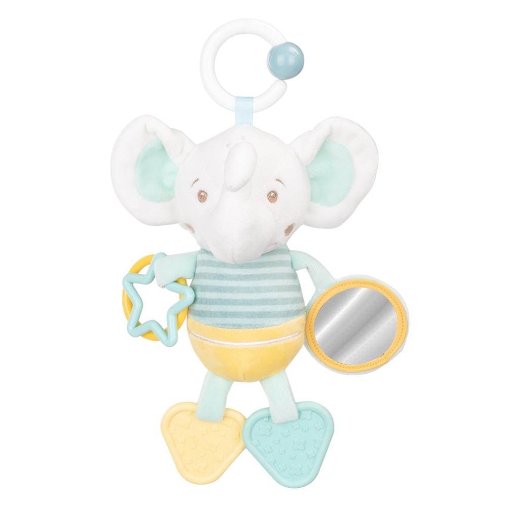 The toy is made of plush material, which is soft and safe for young children to play and explore. With a length of about 27 cm, it is easy for children to hold and have fun with this toy. The elephant has different colors and visual elements that stimulate children's vision and interest.