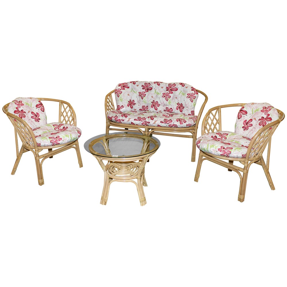 "BAHAMA" set (2 Chair + 1 Sofa + 1 Table with glass + 3 Cushion + 3 Pillow), Size: Chair: 66x67x71cm; Sofa: 66x115x71cm; Table: D.55 x45 cm, Color: Set: Dark Brown; Cushion+Pillow: (Mixed/Flower design), Material: Polyester