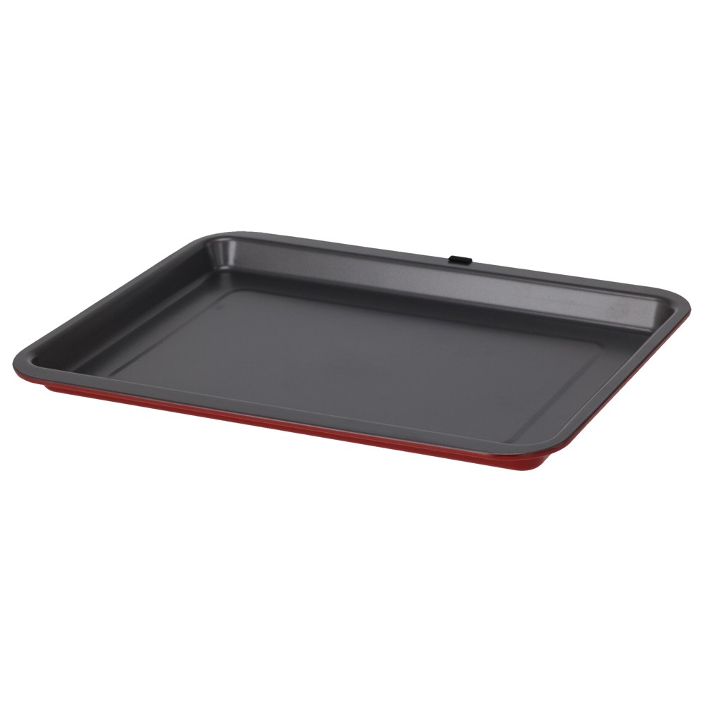 This baking pan is made from durable metal, ensuring even heat distribution for perfectly baked results every time. Available in sleek black or vibrant red, it measures 39.5x30x2.5 cm, making it suitable for a variety of dishes, from cakes and pastries to other oven-baked recipes. Its sturdy and practical design makes this pan an essential tool in any kitchen.