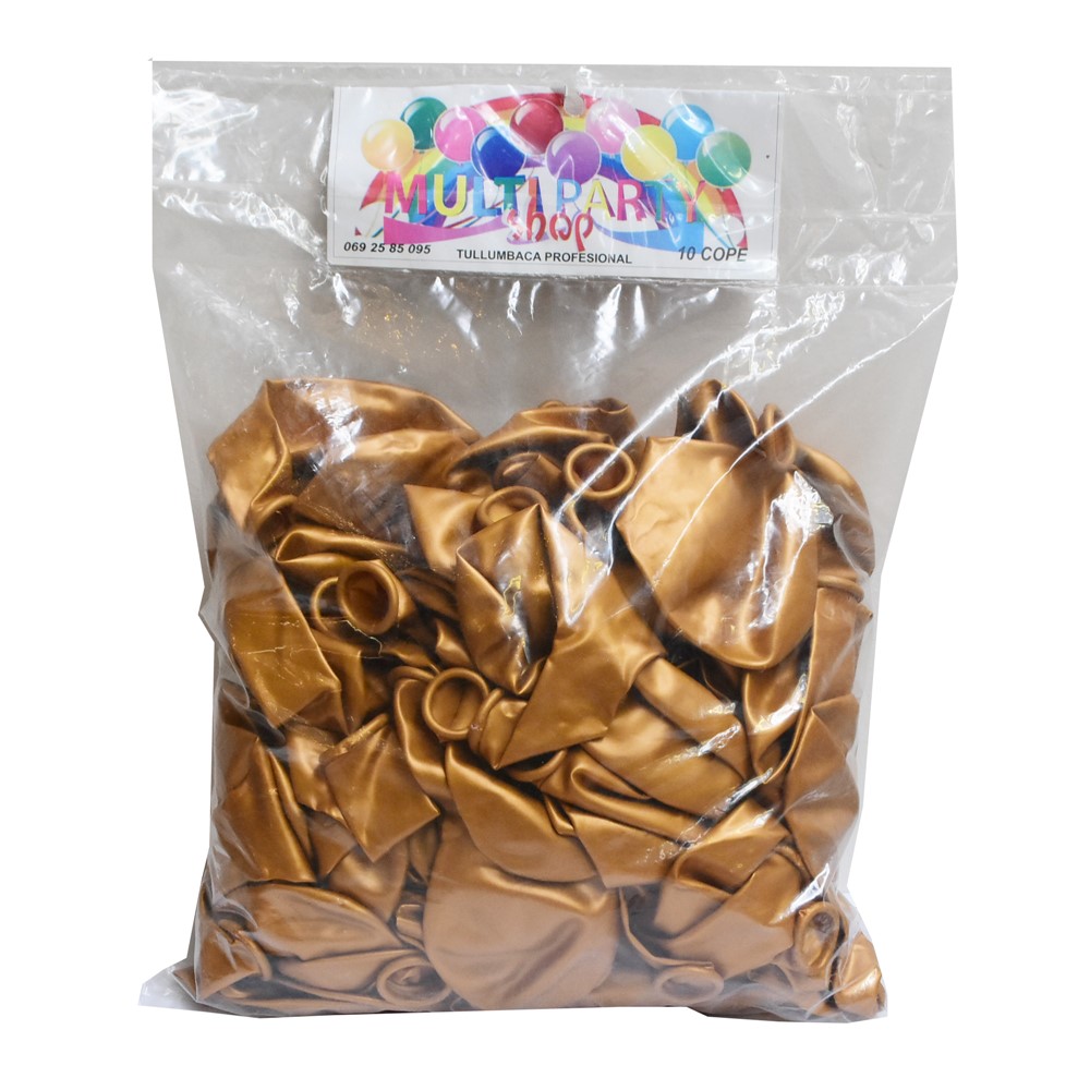 Balloons, which are made of natural rubber (latex) material, with dimensions of 24 cm, in golden color. The balloons are used to create various decorations for parties and events, and can be filled with helium gas to make them float or with regular air to make them last longer. This product is suitable for non-professional use, in home environments, and for professional use, by event organizing companies.