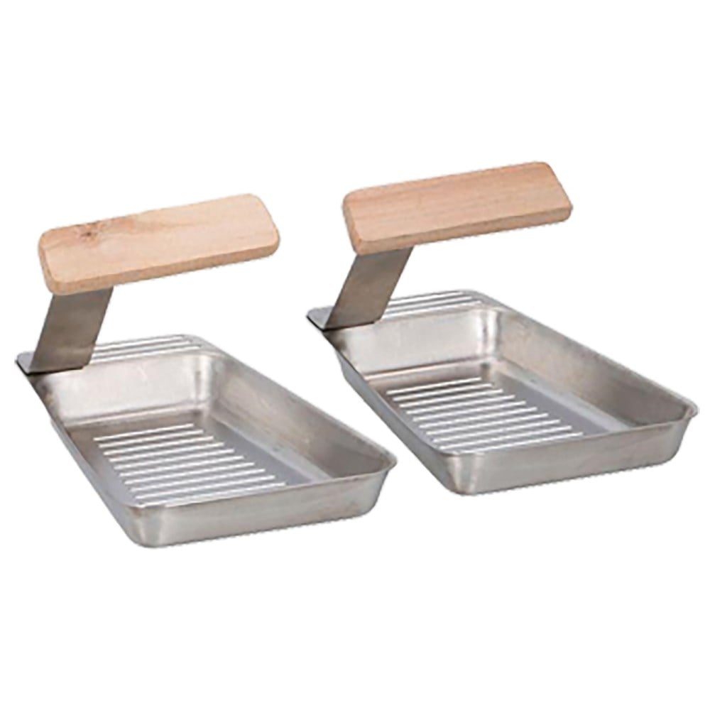 Set of pan for barbecue 2 pieces made of stainless material with wooden handles. The pans are suitable for baking foods that do not require high temperatures for baking as vegetables, fish.