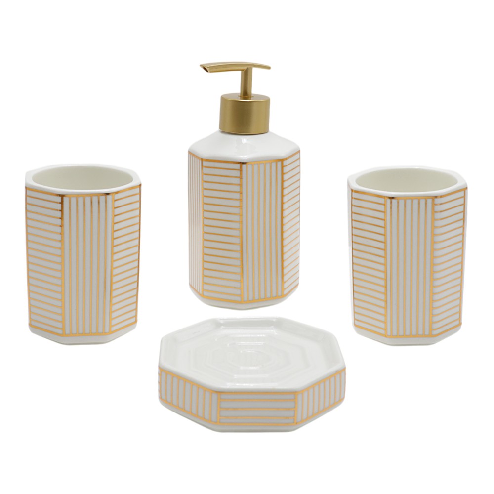 Toilet accessory set "Avril" designed in high quality ceramic in white color and gold lines. With its rectangular shape and neat lines, this practical set will give your bathroom a modern look. The set consists of a liquid soap dispenser, a soap holder, a brush holder and a cotton holder.