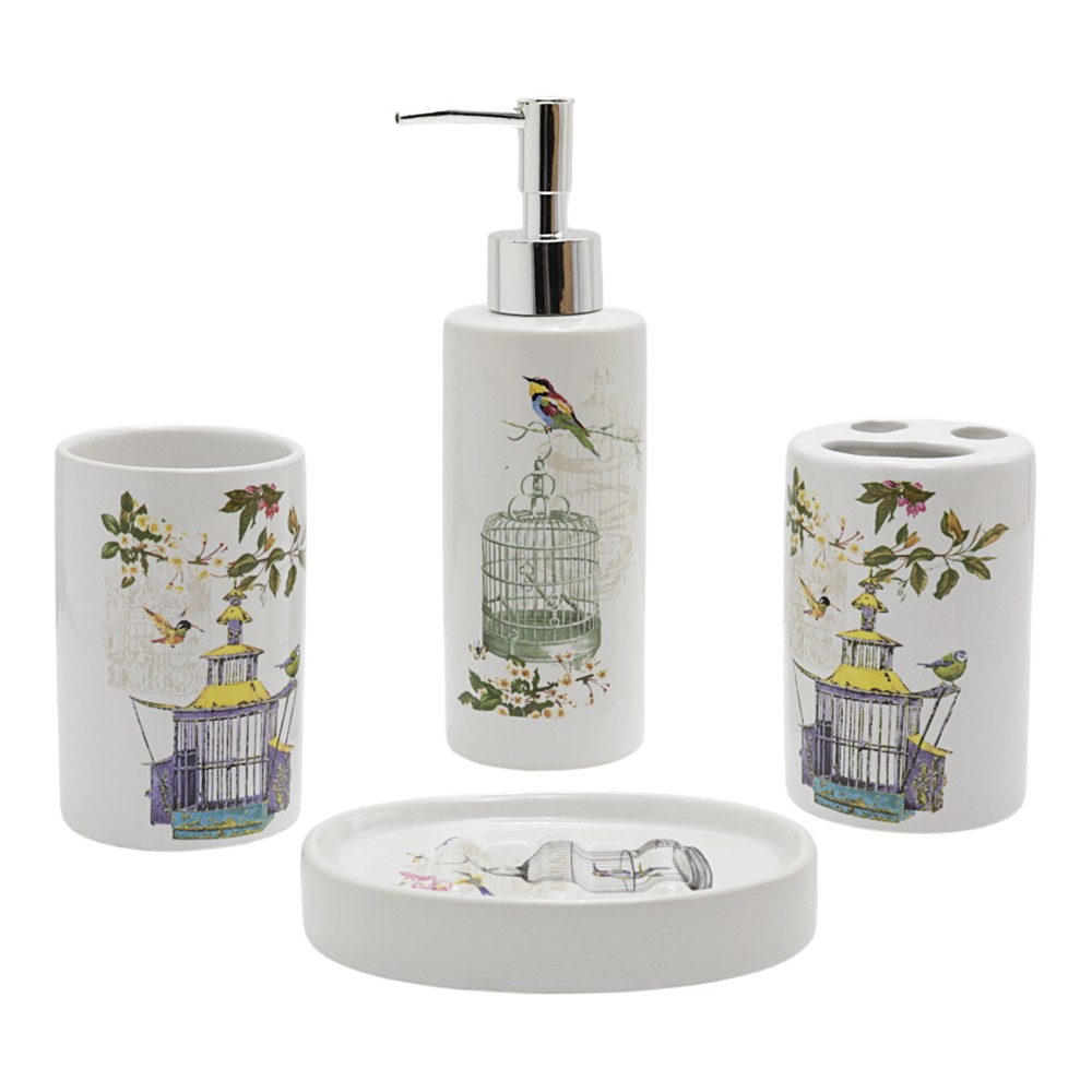 The set of toilet accessories "Canarie" has a design with a focus on nature that will give freshness and vitality to your bathroom. Produced in high quality ceramics in white color, this set fits easily with all types of furnishings. The composition of the set, a liquid soap dispenser, a soap holder, a brush holder and a cotton holder.