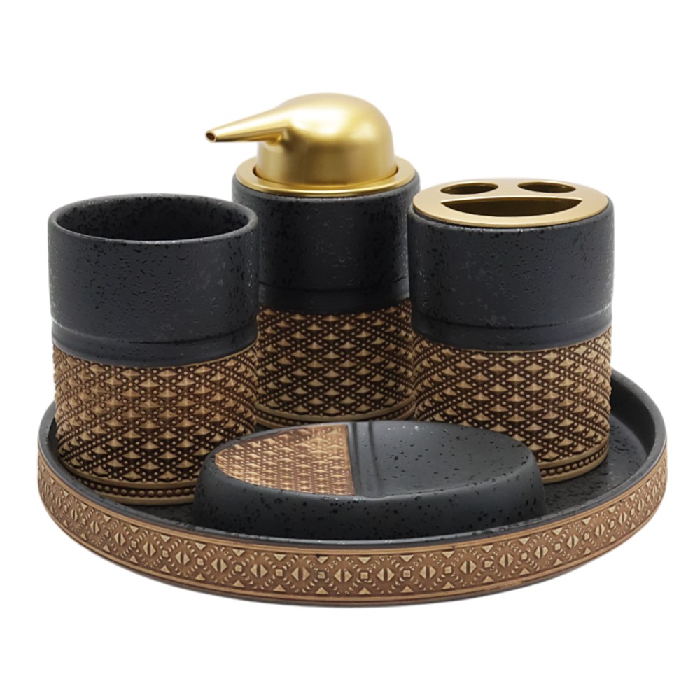 The set of 5 pieces of toilet accessories resting on the "Kohi" furniture, will give a modern and sophisticated look to your bathroom. Produced in high-quality ceramics in black and brown, this set is very practical and can be easily combined with all types of furnishings. The set consists of a liquid soap dispenser, a soap holder, a brush holder, a brush holder and a multi-functional plate.