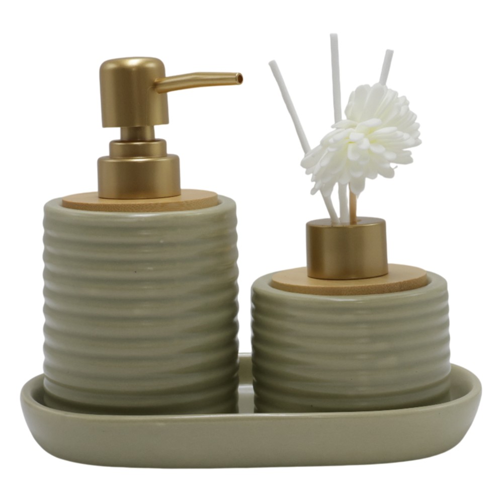 This bathroom accessory set combines the modern style of grey ceramic with the warmth and naturalness of bamboo, creating a sophisticated and harmonious atmosphere in your bathroom. With a minimalist design and durable materials, this set is suitable for offering maximum functionality and ease of maintenance. This combination of grey color with natural bamboo elements is the ideal choice for modern bathrooms that require an elegant and warm touch.