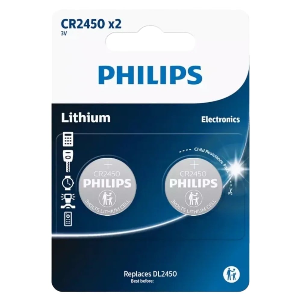 2x Philips button cell batteries CR2450. These button cell batteries are an excellent solution for calculators, watches, remote controls and keys. These batteries come in a pack of 2. These batteries are not rechargeable.