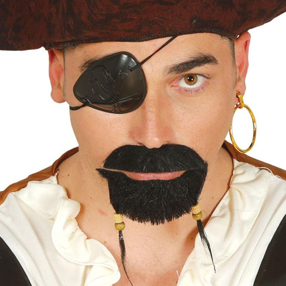 Beard and mustache set for pirate costume, with dimensions of 19.5x14.5x3.5 cm, in black color. Used as an accessory for different Halloween or carnival outfits.