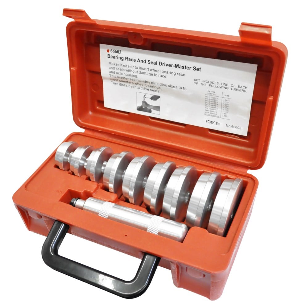 Makes it easier to insert wheel bearing race and seals without damage to race and axle housing. The set includes 9 disc sizes to fit most standard wheel bearing. Turn discs over to drive seals.