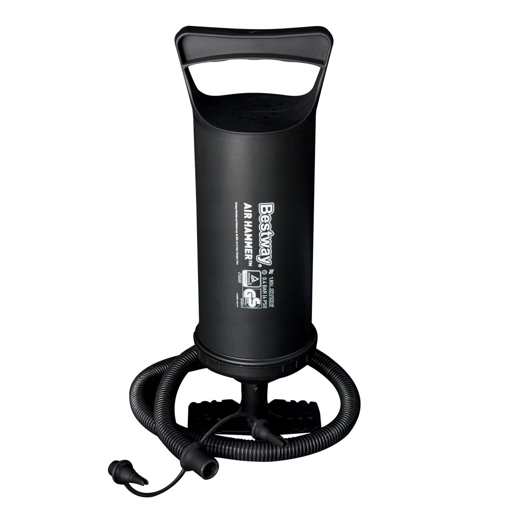 The Bestway® 36 cm Air Hammer™ hand pump inflates swim rings, air mattresses, inflatable boats, toys and other inflatable objects in no time. Above all, it convinces with a maximum and continuous air flow - both when pumping up and when pumping down. The pump is made of robust material and also has three different universal adapters.