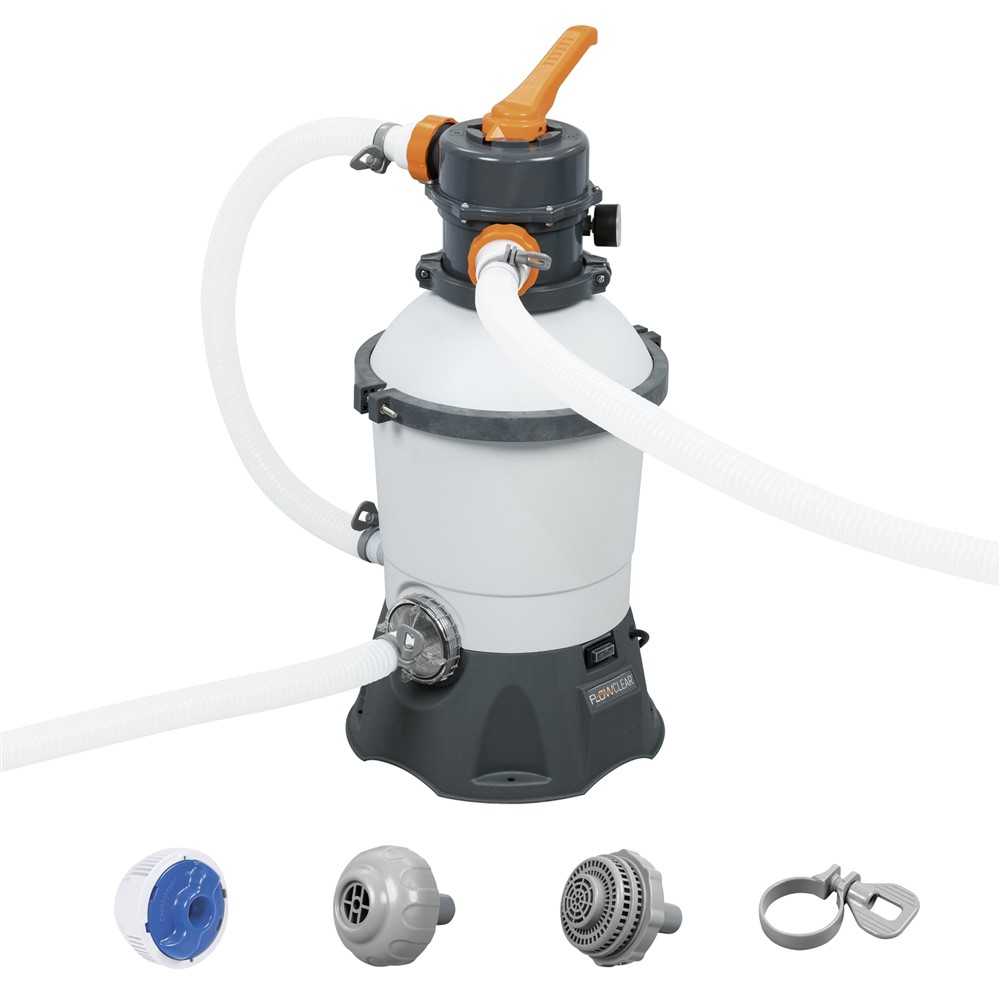 Flowclear™ sand filter pump, made of plastic material, which is resistant to water, to weather conditions and to the corrosion caused as a result of the chemical and electro-chemical agents' action on the material's surface. The pump operates with a 220-240 V voltage and power of 85 W, and it has a filter control system which is equipped with a 6-position valve. The filter tank uses silica sand with grains with a diameter of 0.45-0.85 mm and the pump is used for cleaning and circulating the water in the pool, while eliminating dust, dirt and bacteria. The inner tank is made of water-resistant material that does not rust, it has a diameter of 27 cm, it has a capacity of 8.5 kg and it is equipped with a strainer for separating leaves and other rough debris. The silica sand (code 110274) contains 99% SiO2, it filtrates particles as small as 20 micron and it antibacterial and antimicrobial properties. The pump has a filter system with a flow capacity of 3028 l/hour and it includes connectors with dimensions of 3.2 cm in diameter and 3 m in length, which make it suitable for use with all Bestway pools that have a 1100 to 18100 liters capacity. The set also includes: