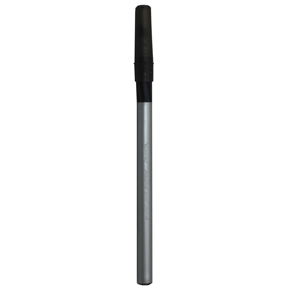 Ballpoint Bic round stick extract with a writing line thickness of 0.35 mm. It is made in a gray plastic case with black accents. The pen has a rubberized flu. Low ink viscosity and a thn needle-shaped writing unit technology.