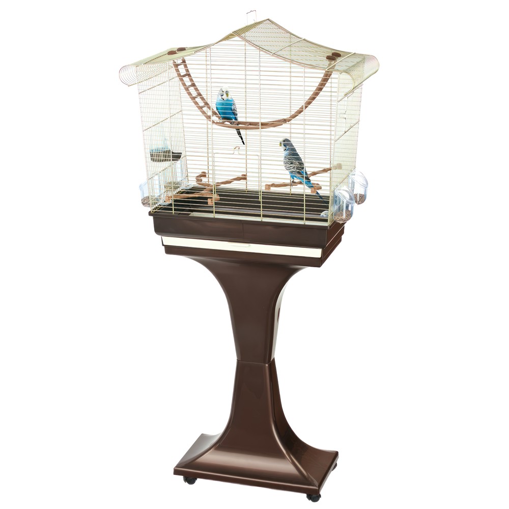 The Imac Sofia bird cage is a perfect combination of elegance and functionality, designed to offer your birds a safe, comfortable and aesthetically pleasing environment. With dimensions H63 x 33 x 61 cm and a support of 133 cm, it provides enough space for movement and daily activity. Its strong and quality structure guarantees long-term durability, while the modern design in **brown with gold** gives it an elegant look that fits into any home environment. The cage includes practical accessories for food and water, as well as a durable holder for maximum stability. Imac Sofia is the ideal choice for the dedicated care and refined style that your birds deserve.
