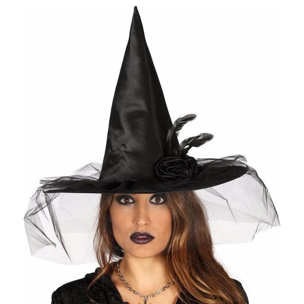 Black witch hat with veil and feather