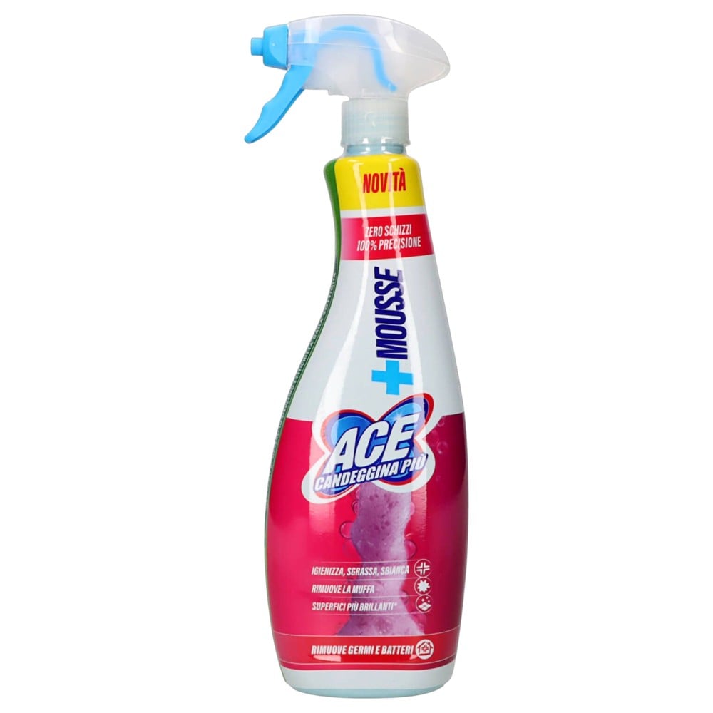 ACE Candeggina Più Mousse guarantees a clean and disinfected home, as well as spotless white clothes. Its special formula sanitizes, removes grease and whitens white clothes and various surfaces in the home. Particularly suitable for sanitizing bathroom fixtures, removing mold and whitening tile joints. Thanks to its mechanical action, ACE Mousse removes bacteria and microbes from surfaces and helps eliminate unpleasant odors, ensuring an always clean and sanitized environment.