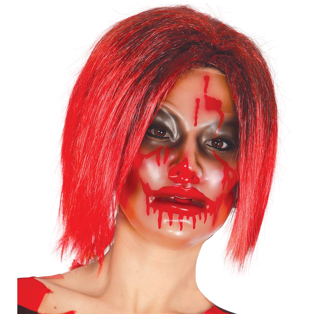 Halloween mask, with blood-stained face, made of transparent red plastic material where the face can be easily distinguished, giving the idea of a more natural bloody face. Suitable for use on birthdays, Halloween, etc. Used by children over 12 years and adults.