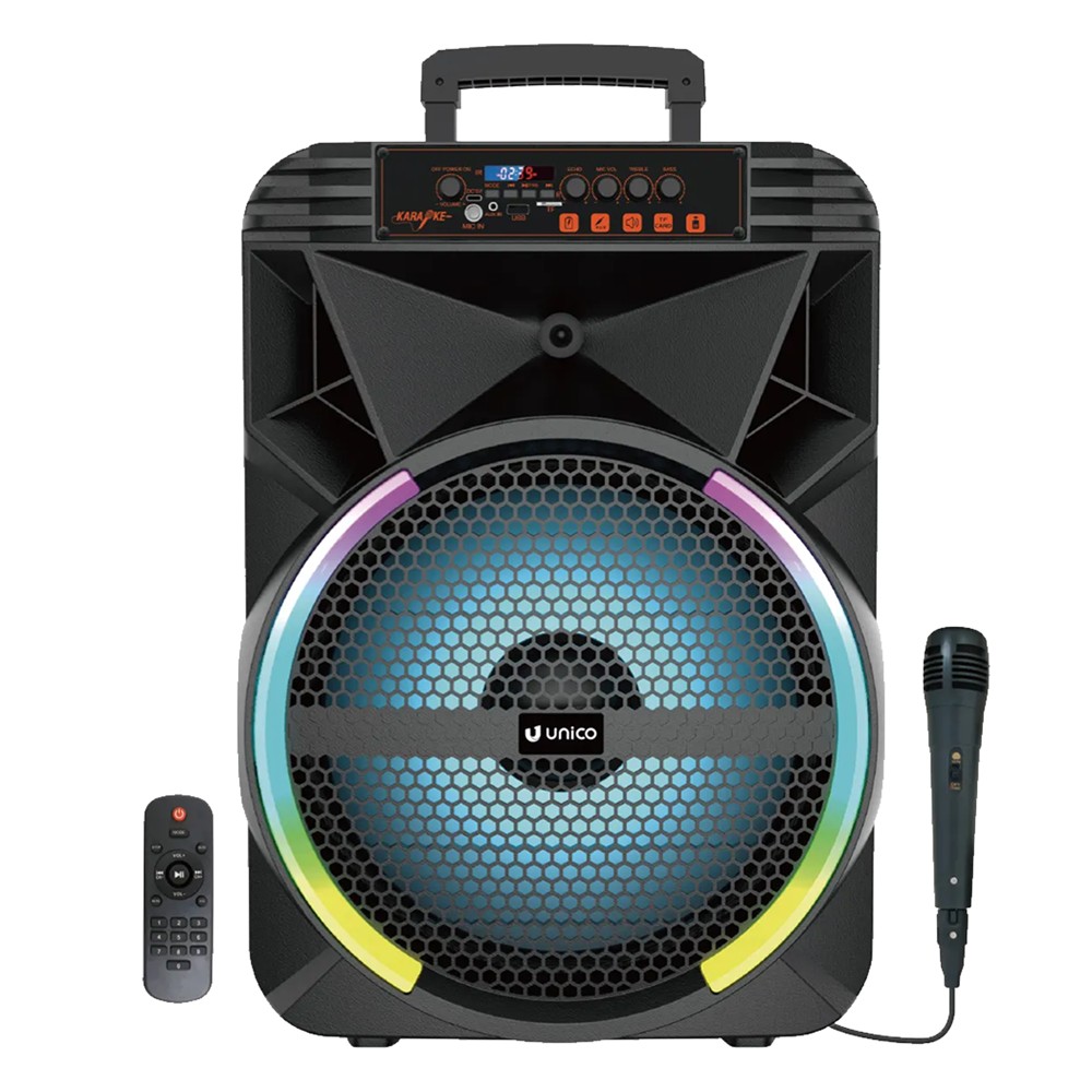 The Unico BS9371 Bluetooth speaker is a powerful and multifunctional device for music and entertainment. Equipped with Bluetooth 5.1 technology and 20 W power, it offers clear and powerful sound, suitable for indoor and outdoor environments. The 3600 mAh battery ensures long use, while the RGB lights function brings attractive visual effects that create a dynamic atmosphere. The speaker also includes a microphone, making it ideal for singing, presentations or entertainment activities. With dimensions of 400x280x571 mm, its modern and durable design makes it easy to transport and place in any space, combining functionality, style and performance in a single product.