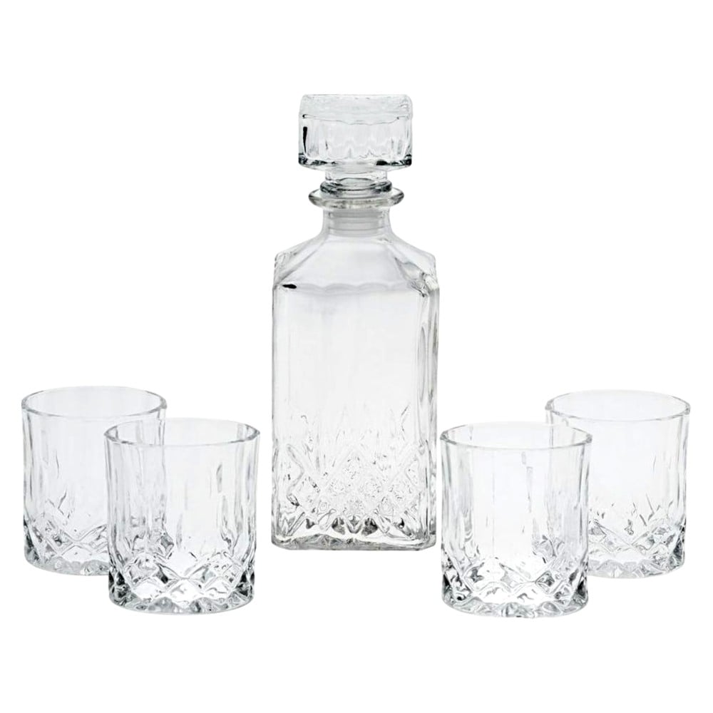 Complete your bar with this fine whiskey decanter set. The set includes a timeless, squared decanter with a fluted stopper & 4 tumbler glasses. Masterfully crafted in a beautiful, classic diamond cut, with distinctive light reflective starburst detailing. Perfect for entertaining thanks to their elegant, crystal design.