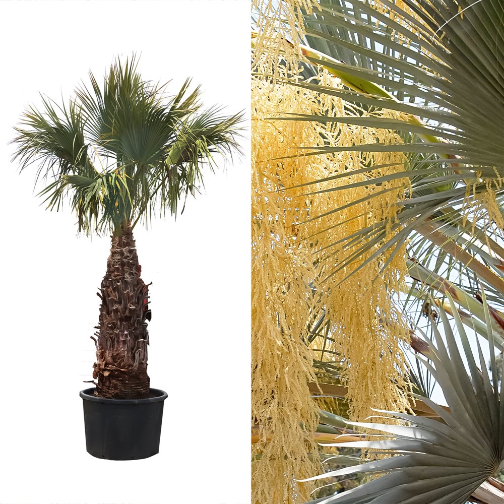 Brahea armata (mexican blue palm), is native to Mexico. It has stiff, fan shaped foliage in an attractive blue grey-green. It is perfect for growing as part of a tropical border, alongside other tropical plants such as banana and canna. It is also suited to indoor or conservatory growing, and is well suited to growing in a large container. Grow brahea armata in a sheltered spot in well drained, alkaline soil in full sun. Mature plants are hardy enough for a temperate climate but young plants will need protection in winter. Alternatively, grow in a pot as a conservatory specimen and take outdoors in summer.