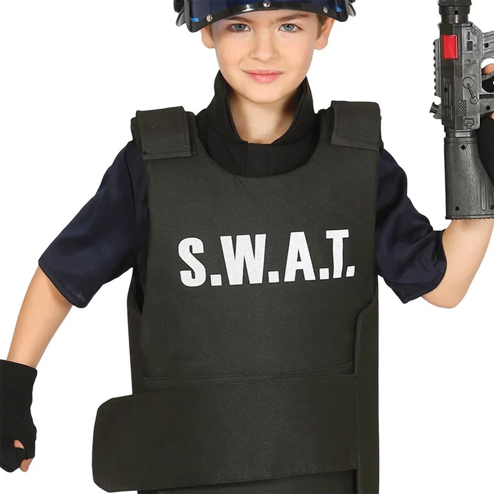 Bulletproof vest for children SWAT harness, made of polyester material, in black color, size 41x53x3 cm. Suitable for 6 to 8 years old. The vest is a must for any person who will imitate the SWAt team.