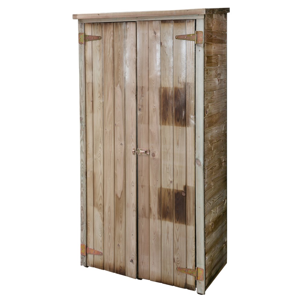 Solve your storage problems. This extra large storage shed keeps items safe, dry and clean. Roomy enough to store lawn equipment and furnishings, strong enough for power tools and sporting gear, etc. Features extra wide front opening for easy access, and adjustable shelving to organize recreational and workshop essentials. Crafted of solid wood harvested and resistant. Moisture resistant for maximum weather protection during all four seasons.