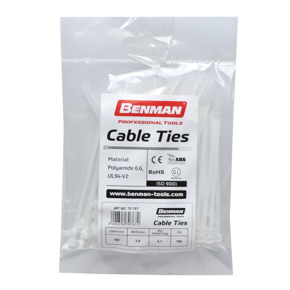 CABLE TIES, WHITE, BENMAN, 100mmX2,5mm (100pcs)