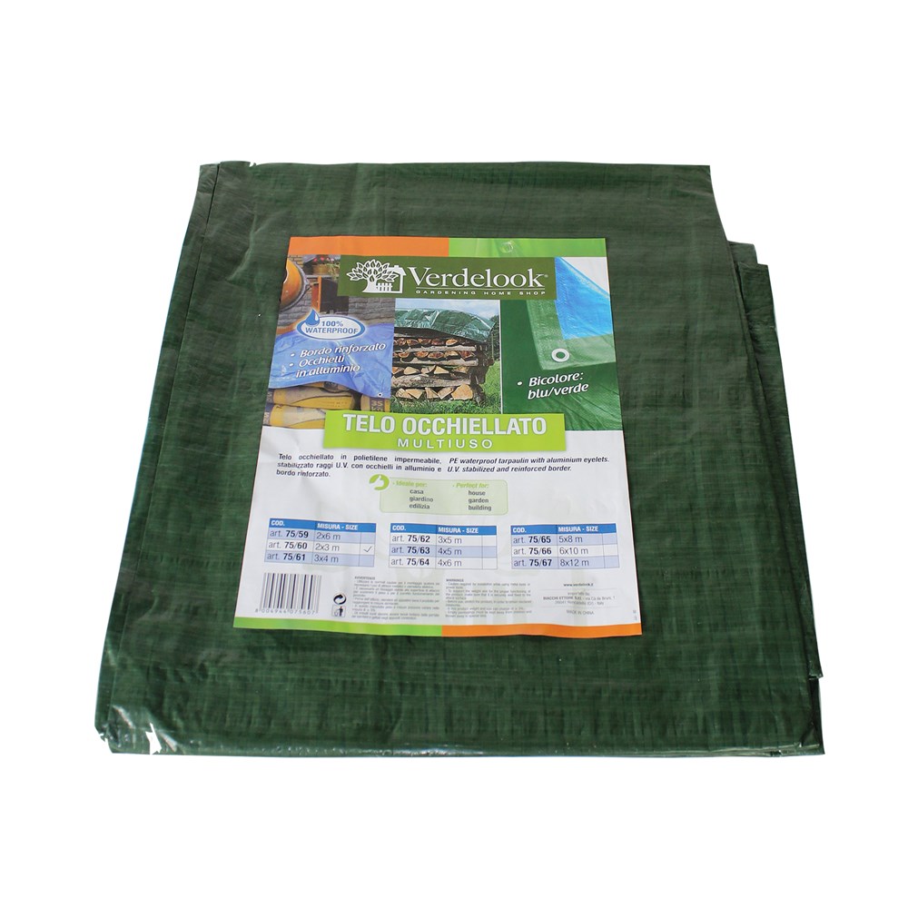 PE waterproof tarpaulin with aluminiums eyelets. UV stabilized and reinforced border. It is used to cover different kind of products ( cars, wood etc)