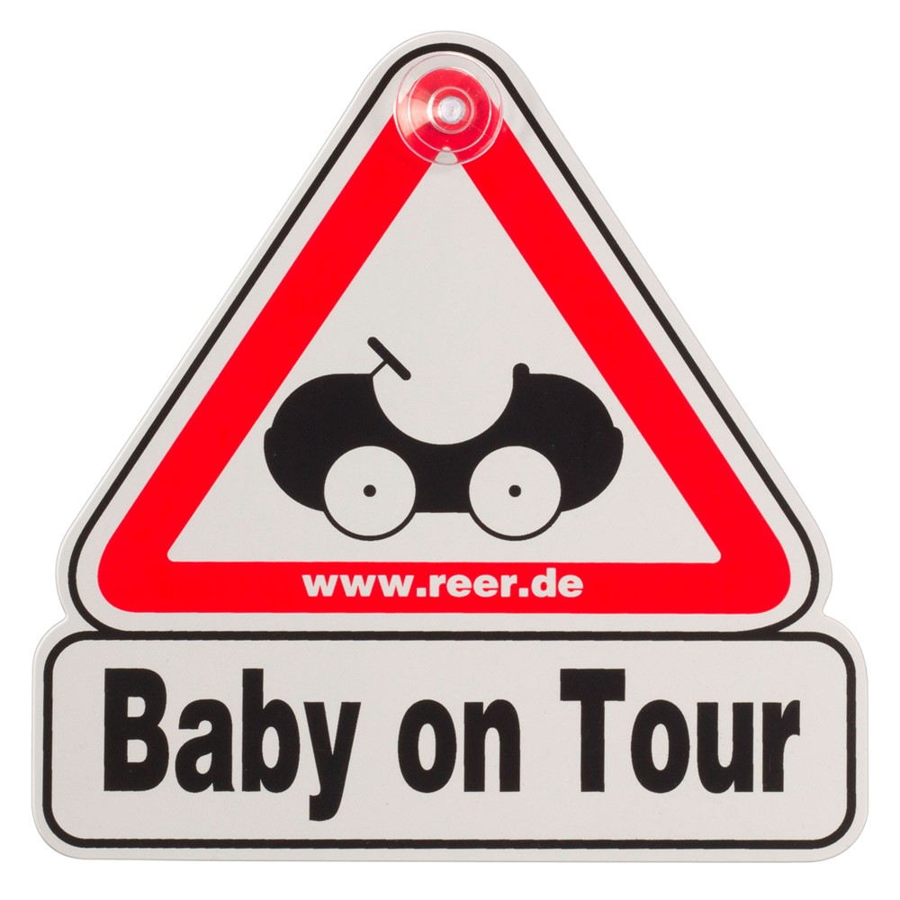 Car sign for baby on board, made of plastic material, in white and red colors. It can be used to inform other road users that there is a baby in the car, while reducing the risk of possible car accidents. It can be easily attached in the rear or side windows of vehicles and it does not create any limitations on the driver's field of view.