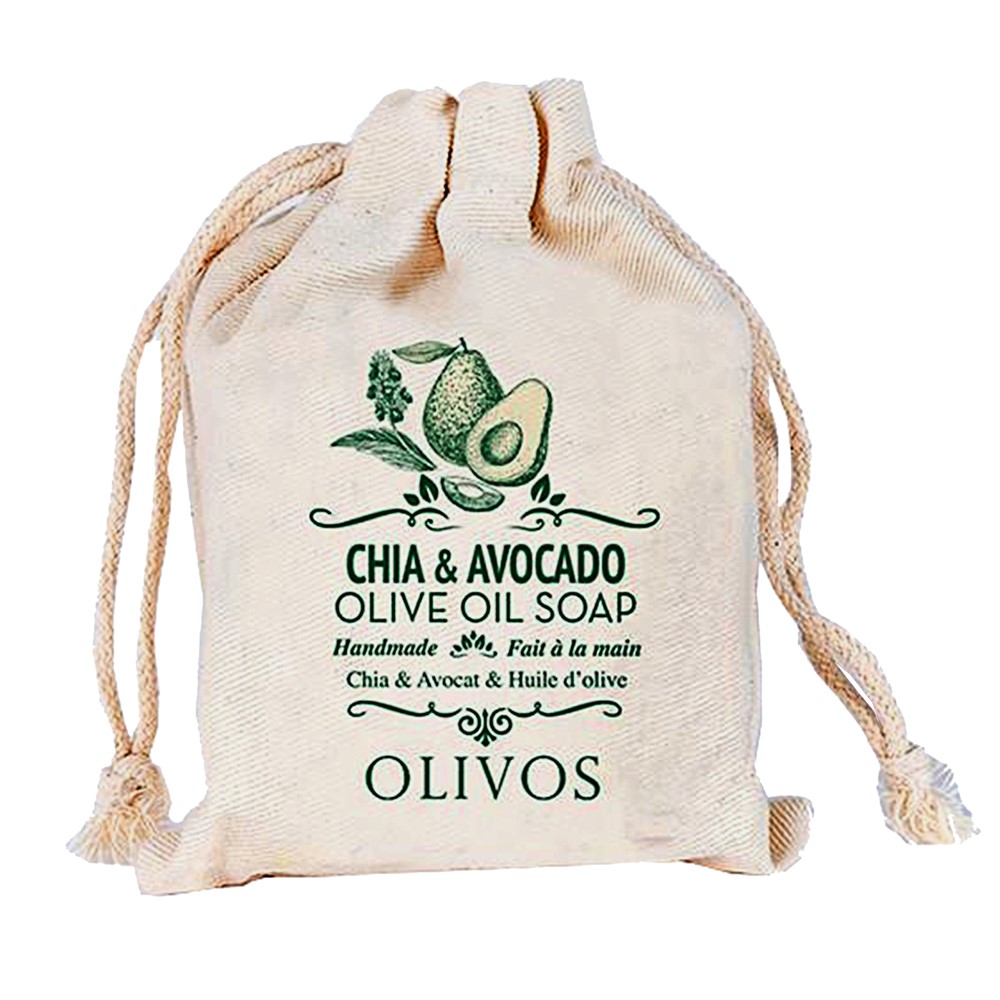 Soap in canvas bag, which contains extra virgin olive oil, avocado extract and chia seeds, with nutritional value for the skin. It softens and moisturizes dry skin and hair giving them a more natural and fresh glow, it is effective in removing dead cells and impurities that settle on the skin, as well as it gently cleanses and soothes the skin. This product is suitable for use on all skin types.