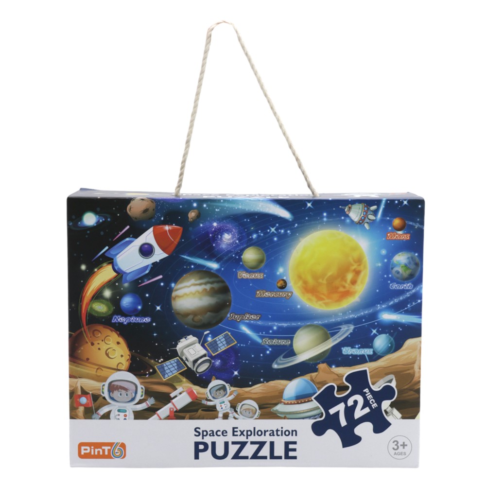 This fun and educational 72-piece puzzle features a representation of space with planets, stars, and cosmic elements, making the game a fun and educational experience. Designed with vibrant colors and clear images, it helps children develop logical skills, concentration, and memory. The durable and safe material ensures long-term use.
