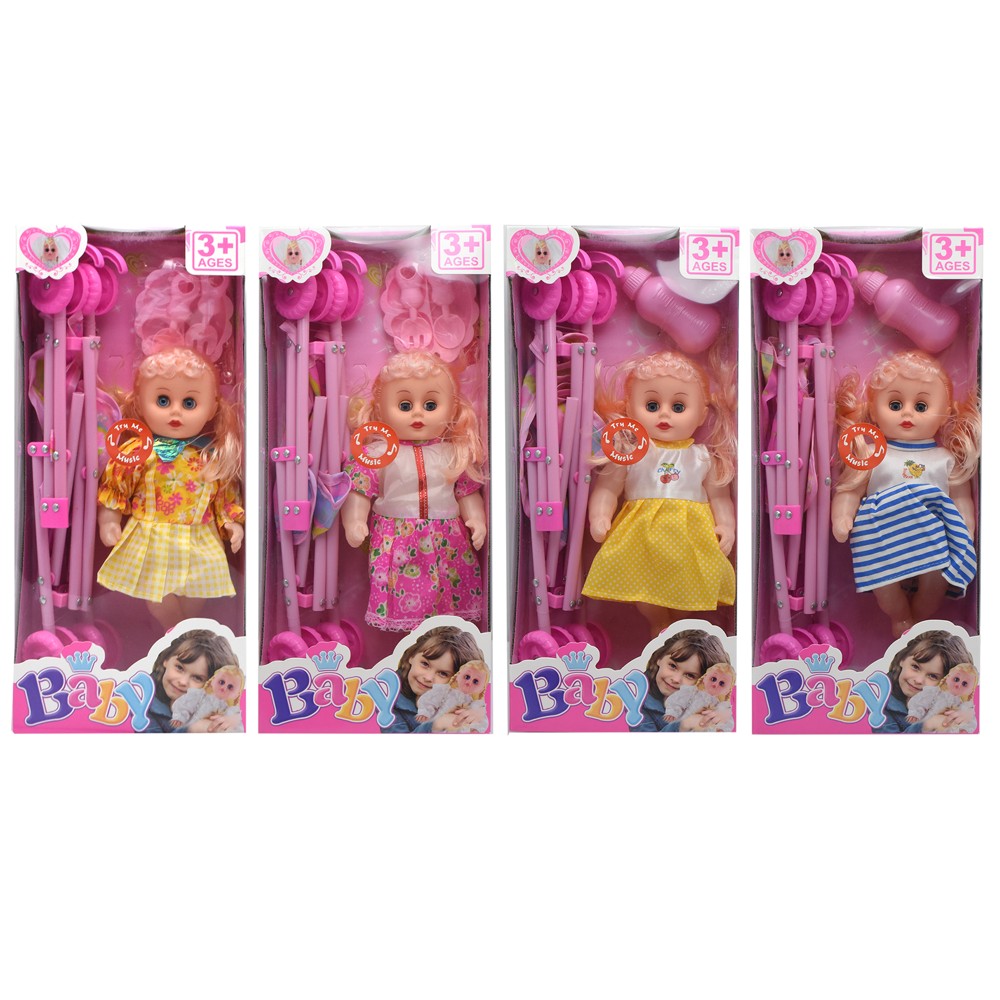 Toy set for girls, which includes a baby doll and a baby carriage, made of plastic material, with synthetic polyester material lining, in different colors. This toy helps develop imagination, develop senses and develop learning skills in children through role play. The component material and paint do not contain toxic or harmful content for children and are certified for safety in use. This product is suitable for children over 3 years old.