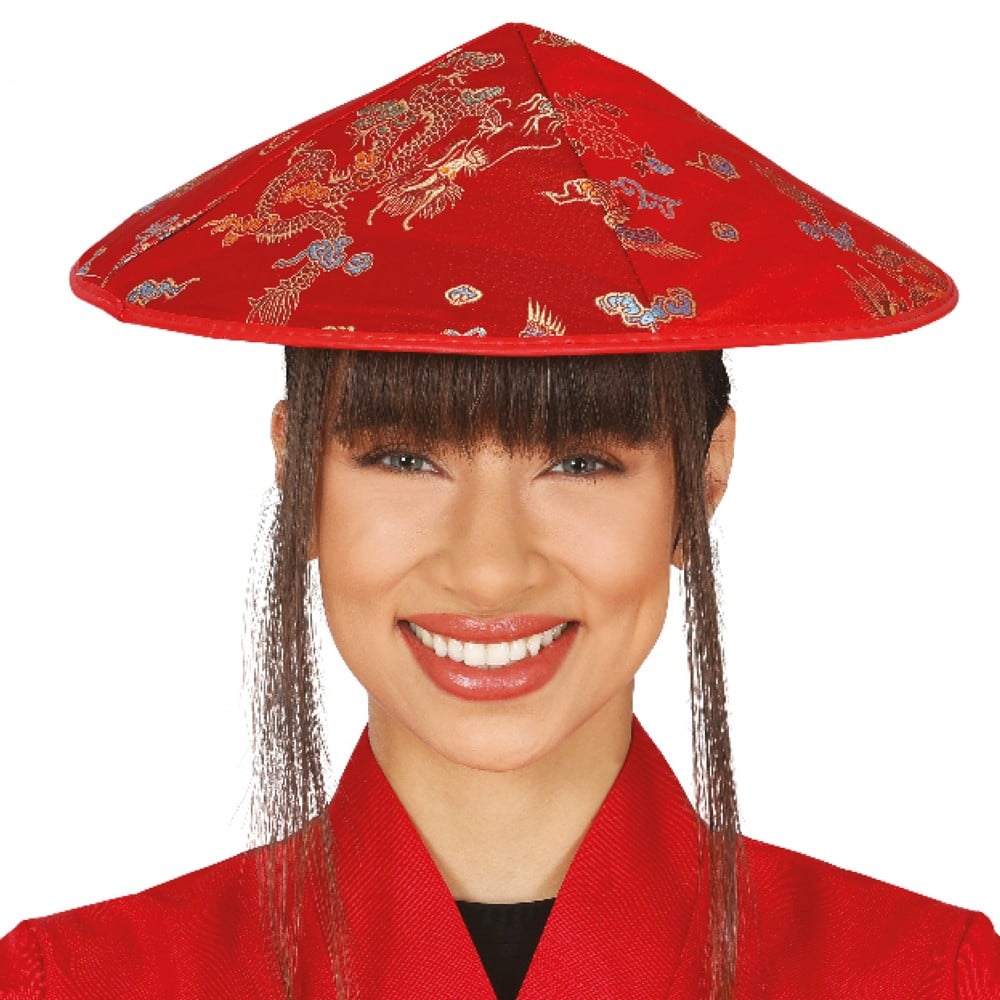 Chinese hat for women, made of polyester material, in red color. It is used as an accessory for different Halloween or carnival outfits.