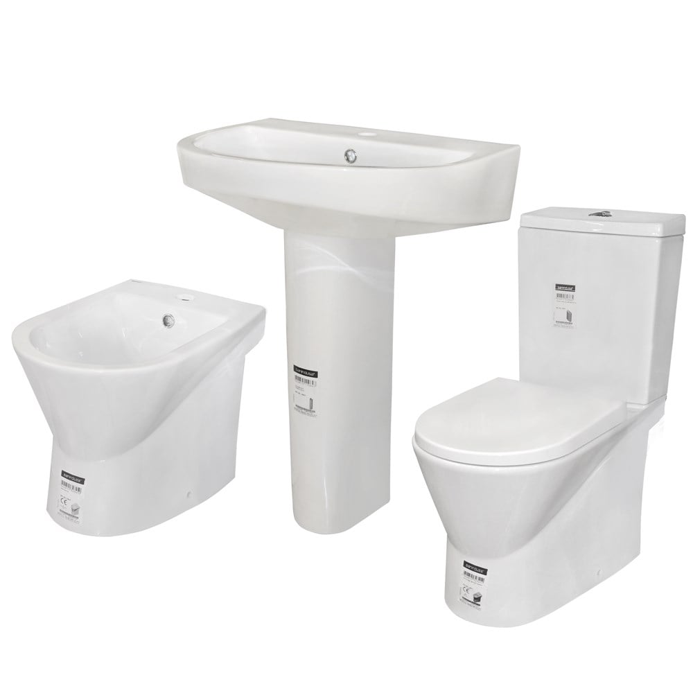 Universal toilet set + Bidet + CITY sink features the essence of traditional curved shape with delicacy and clean lines. With a solid and symmetrical construction, this toilet set delivers style to your bath. The white porcelain color is easily combined with any decor. The toilet set features a simple installation system and is easy to install. Add your bath a practical and quality product! WC 63x35x81 cm Bidet 55x35x39 cm Basin 65x48x85 cm