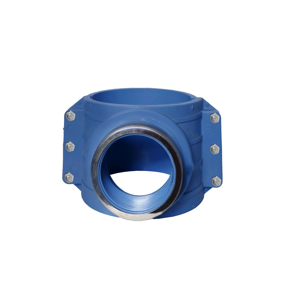Clamp Saddle of PP 160mm with gate 4" used widely today in European for making drinking water from main lines. Clamp Saddle Ø 160x4" with female gate caught with main line pipe mechanically with bolts, for joining the fillet recommend tu use teflon. Manufactured with European standards, resistant to corrosive materials designed to withstand pressure up to 10 Bar.