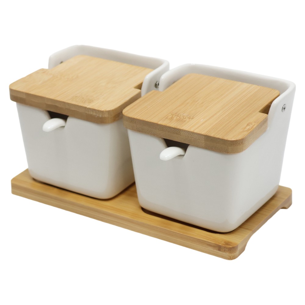 Set of two elegant brown and sugar holders, made of ceramics and bamboo. The product comes in white and brown, with 10x20x9 cm dimensions, offering a great choice for organizing the kitchen.