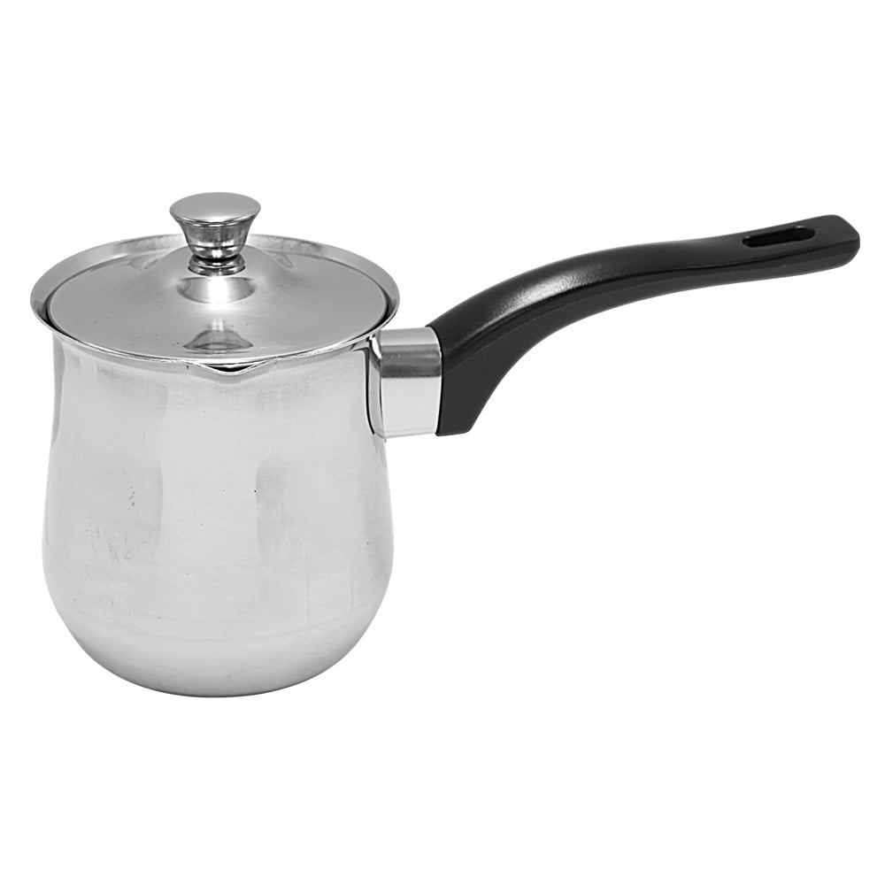 The coffee pot with lid is made from high-quality stainless steel and durable plastic, featuring a silver and black color combination. With a 9 cm diameter and overall dimensions of 10×21 cm, it provides excellent heat distribution, a secure grip, and is ideal for preparing traditional coffee with both style and convenience.